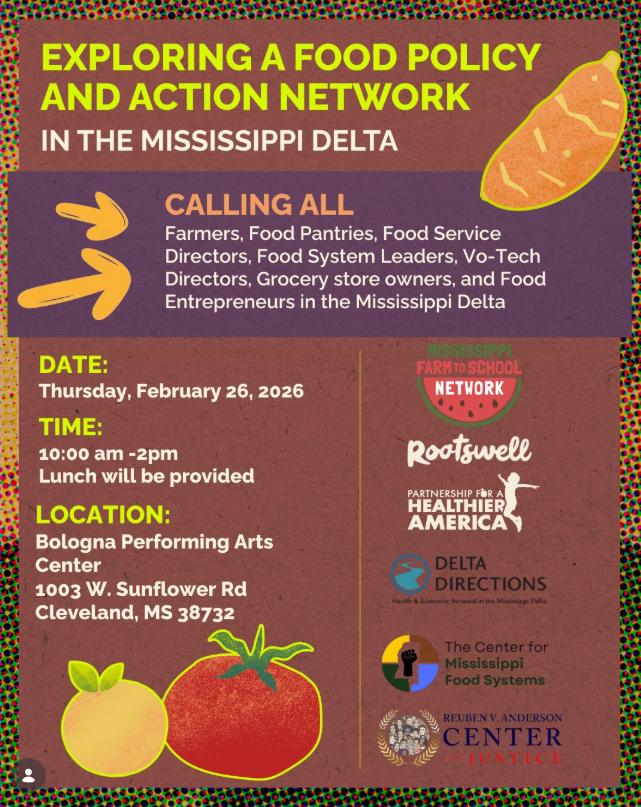 We’re coming together with Rootswell, Partnership for a Healthier America, Delta Directions, The Center for Mississippi Food Systems, and Reuben V. Anderson Center of Justice for the 1st Delta Food Policy & Action Coalition Convening to explore the future of food policy and action in the Mississippi Delta region.